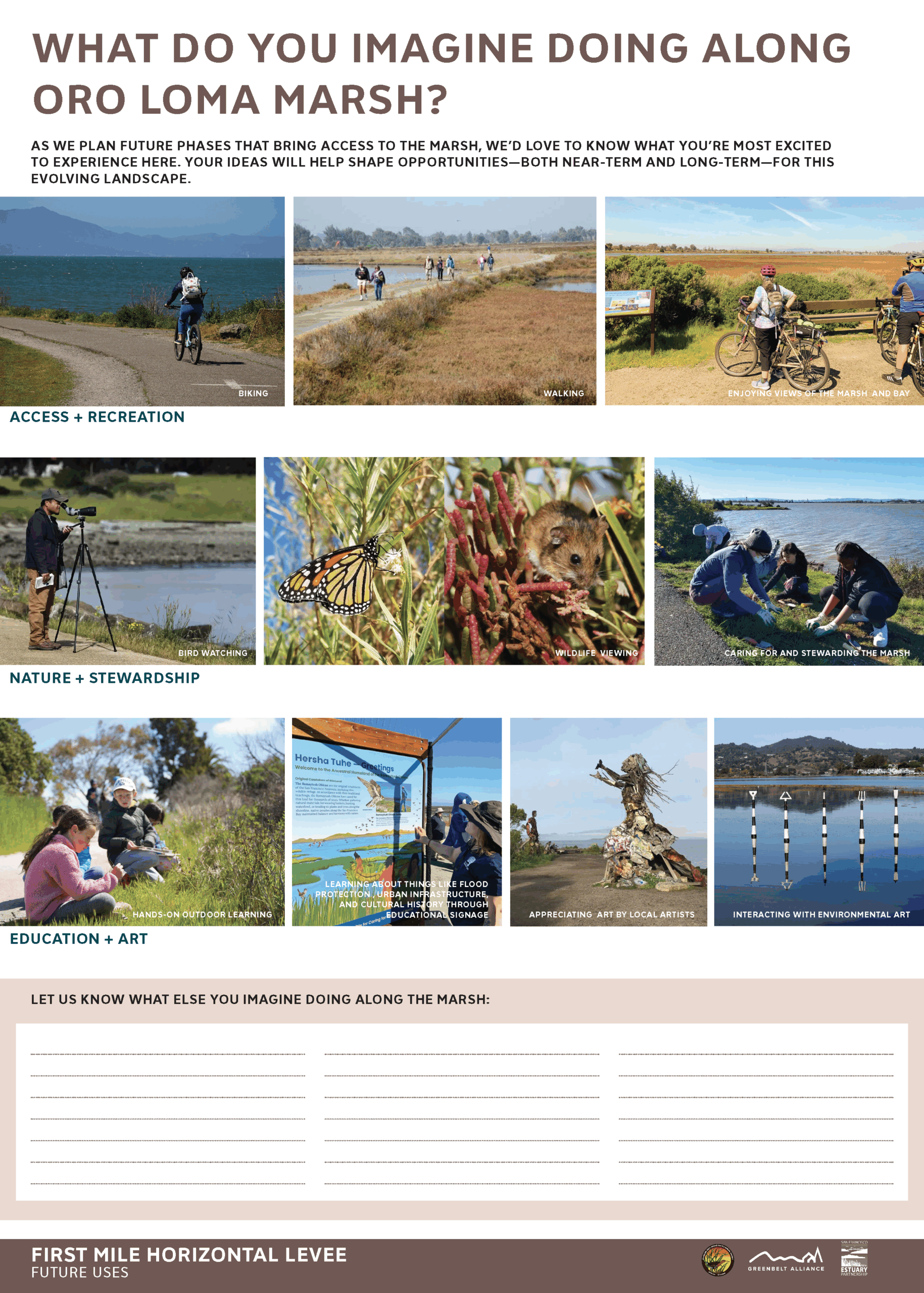 Located along the Oro Loma Marsh between Bockman Canal and Sulphur Creek, the First Mile Horizontal Levee is a groundbreaking project and the first full-scale “living levee” in the Bay Area that is designed to improve water quality while enhancing sea level rise resilience. Led by the East Bay Dischargers Authority (EBDA) in partnership with SFEP and a team of engineers and designers, the project transforms a conventional levee into a broad, gently sloped landscape planted with native vegetation.