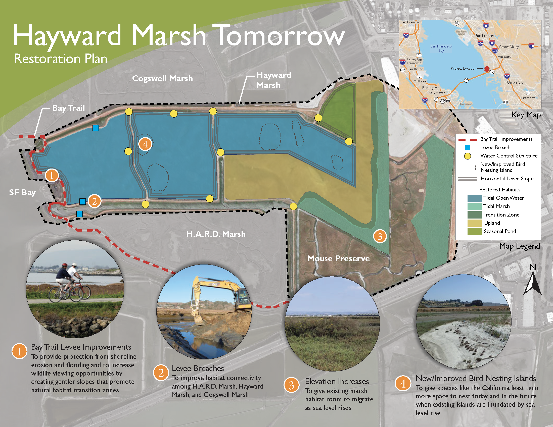 The Restore Hayward Marsh Project will implement the HASPA Shoreline Adaptation Master Plan by protecting and restoring Hayward Marsh’s existing biodiversity, preserve and enhance public access features, design the marsh to be resilient to climate change, and improve nesting bird islands. Project improvements will include widening of the Bay-side levee which currently supports the San Francisco Bay Trail to protect the trail from erosion and flooding and enhance the trail’s longevity; the Marsh’s existing central levee will be raised to protect tidal marsh habitat, salt pannes, and new nesting bird islands from sea level rise; and new upland habitat will be created behind this raised levee to allow the marsh to migrate as sea level increases.